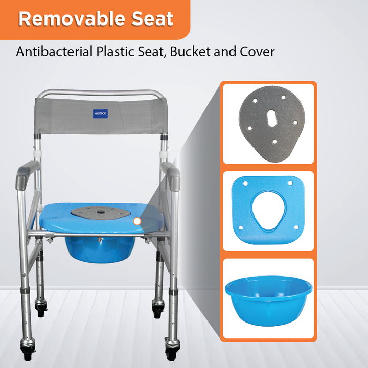 This bath chair has Washable Back rest with Anti-bacterial plastic seat with drainage holes, bucket, & cover along removable commode pan for emptying & cleaning toilet waste.