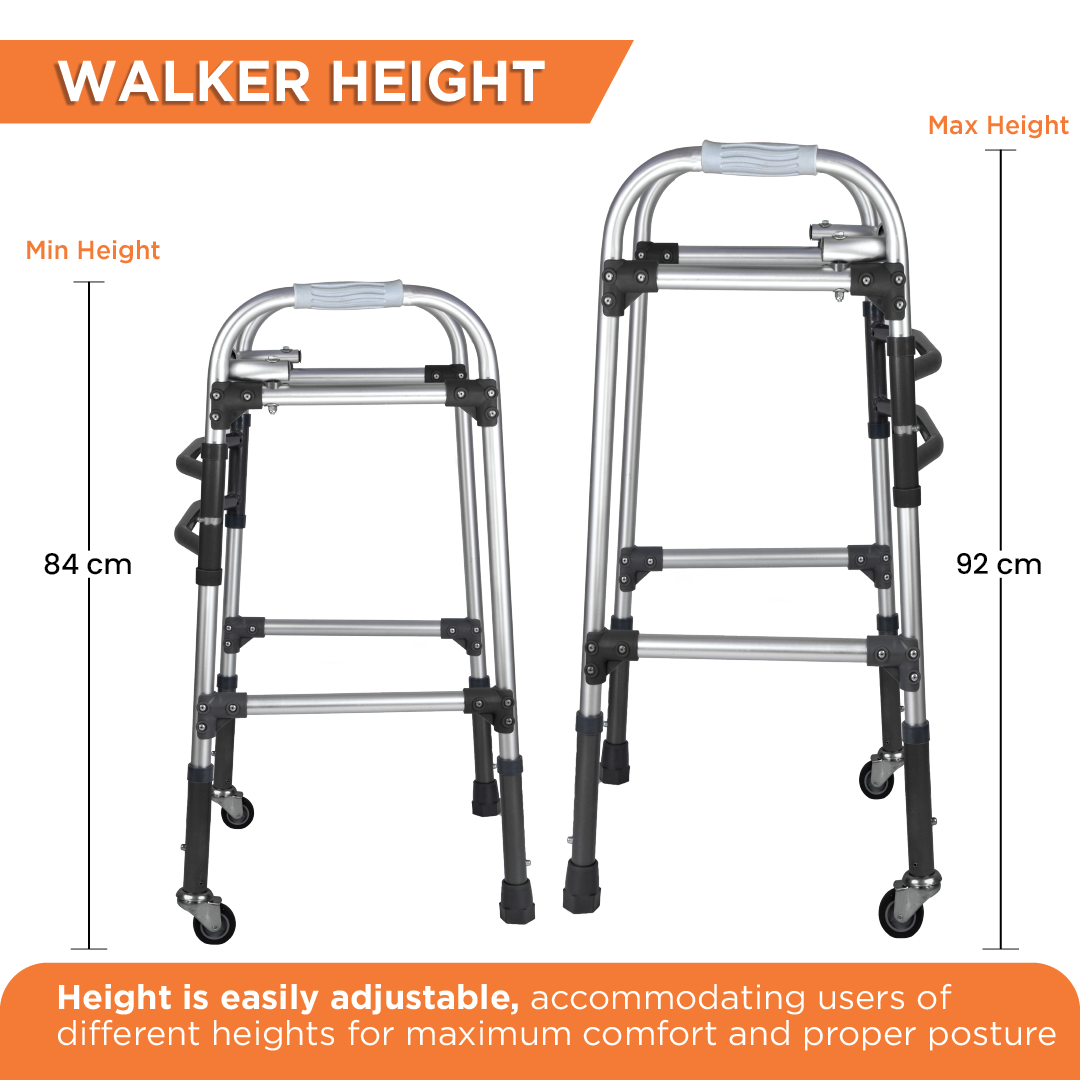 Can be adjusted to suit individual needs. Walker height can be adjusted from 84 cm to 92 cm from the ground to the walker hand grips