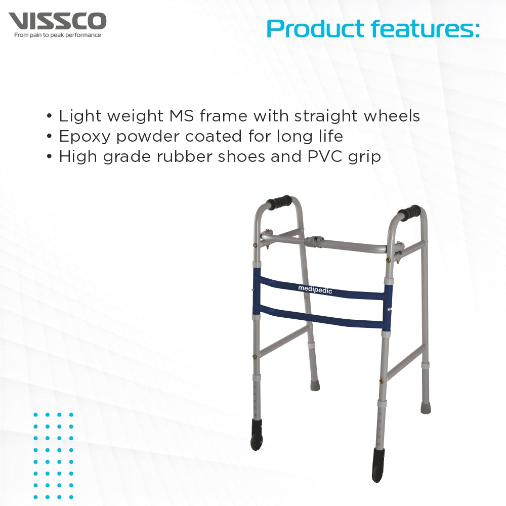 Sturdy MS frame, high-grade rubber shoes and PVC grip ensures maximum strength while remaining lightweight. It comes with rotating wheels for easy movement.