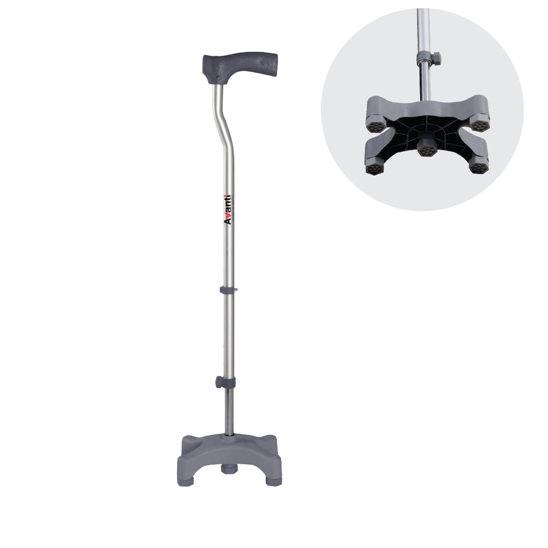With a push-button, the height can be adjusted on the walking stick for elders. The rubber shoe is skid-resistant in nature and the quadripod base gives the support stick for walking better stability.