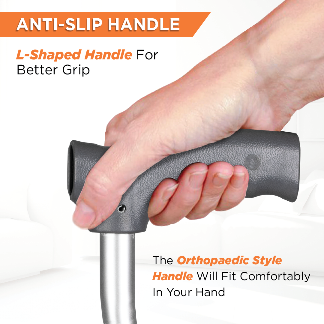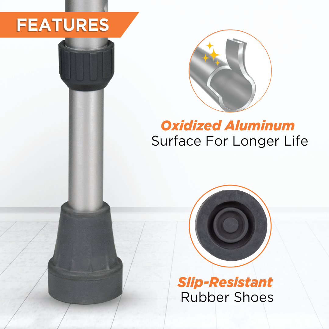 With a push-button the height can be adjusted easily. The big rubber shoe is skid-resistant in nature & gives better grip
