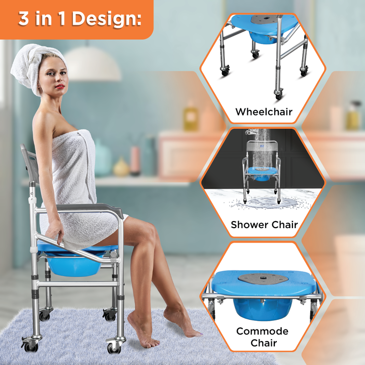 An innovative chair that can be used as a standard commode chair, shower chair or a frame that goes over an existing Toilet bowl (WC).