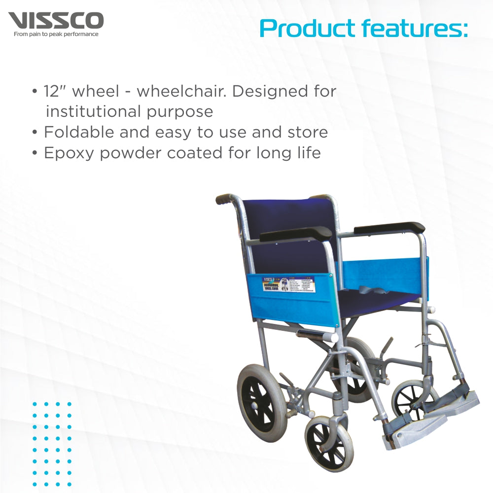 Institutional 12” rear wheel wheelchair is designed for attendant propelling which makes the wheelchair durable with a weight-bearing capacity of 100Kgs.