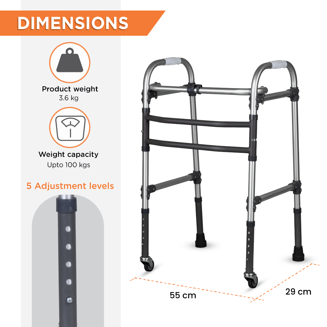 Can be adjusted to suit individual needs. Walker height can be adjusted from 84 cm to 92 cm from the ground to the walker hand grips