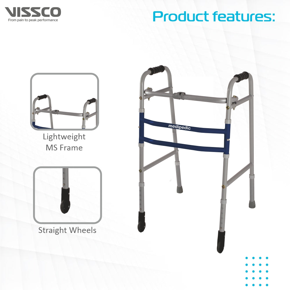 Sturdy MS frame, high-grade rubber shoes and PVC grip ensures maximum strength while remaining lightweight. It comes with rotating wheels for easy movement.