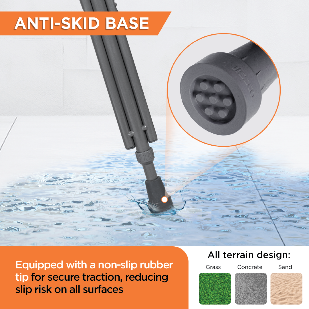 With a push-button the height can be adjusted easily. The rubber shoe is skid-resistant in nature and allows you to walk with confidence while using the stick