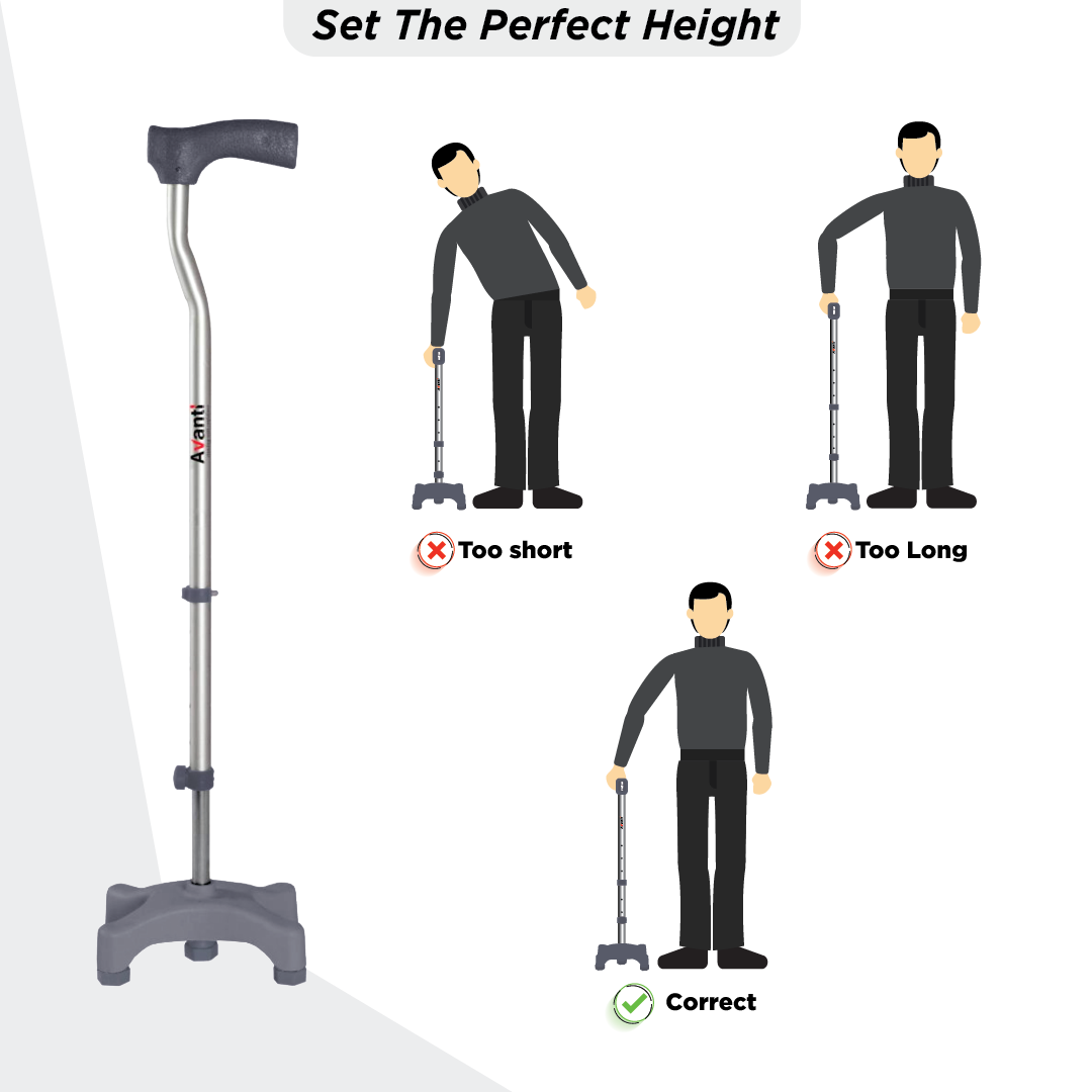 With a push-button, the height can be adjusted on the walking stick for elders. The rubber shoe is skid-resistant in nature and the quadripod base gives the support stick for walking better stability.