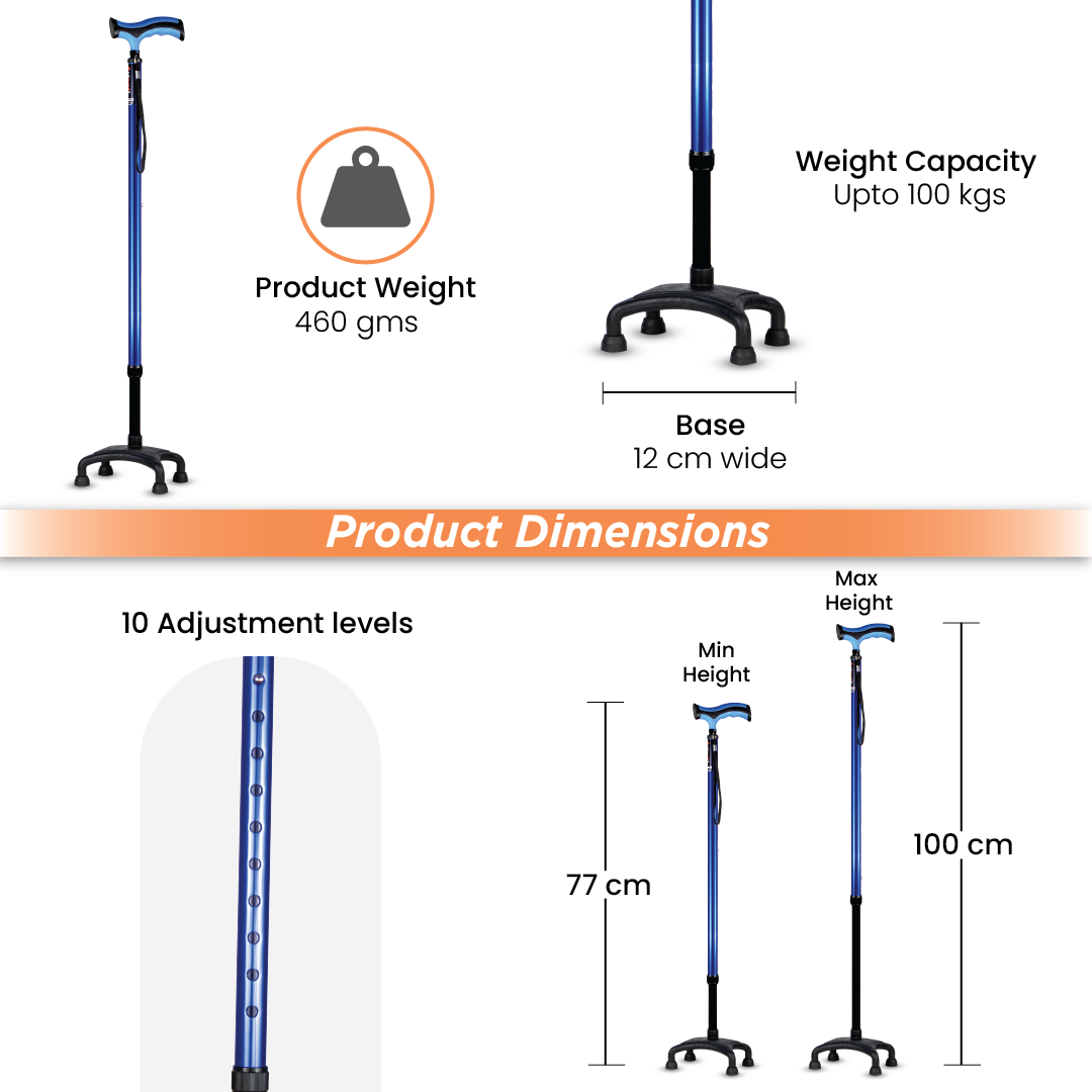 The stick weighs under 0.46 kg & supports a person’s weight up to 100 kgs. making it very stable. It has an elegant look and is durable