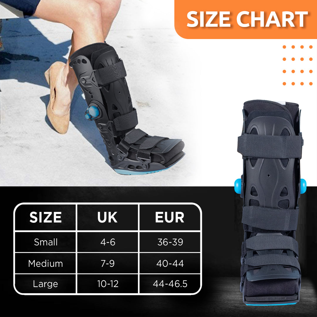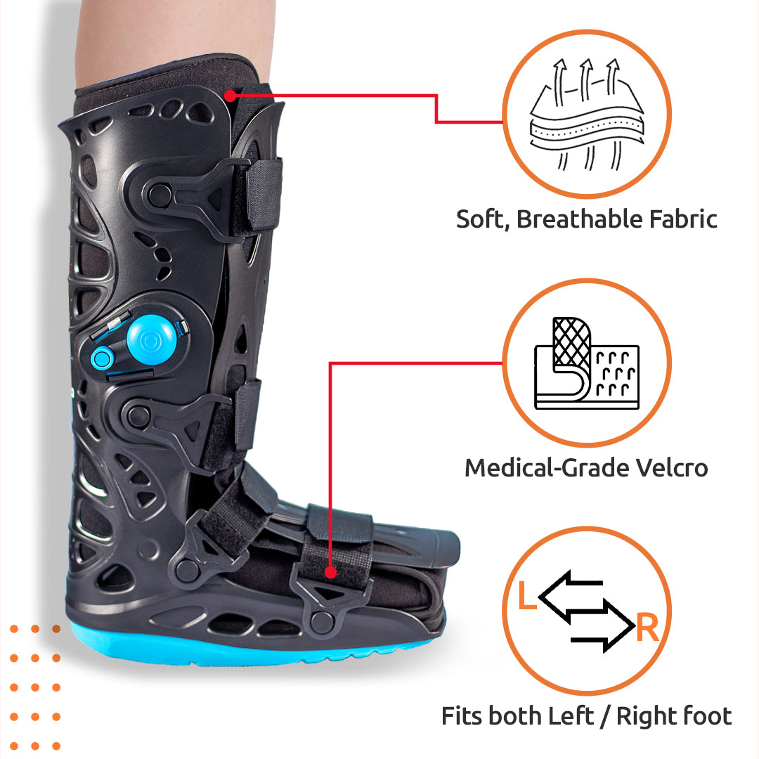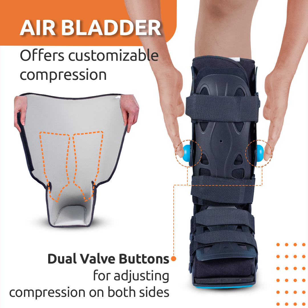 The Pneumatic Walker Boot provides maximum support and stability to the ankle and is light weight and durable. Its Rocker sole design promotes natural gait and the Front panel with inflated air cell provides for complete protection and support. It also helps in pressure offloading and enhances blood flow. The Double air valve offers pneumatic compression to promote callus formation over fracture site and reduce swelling. Inflation can be customized to desired compression level with the air valve. The detachable soft cushion provides comfortable perfect fit